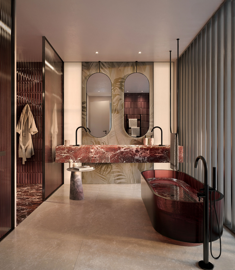 Refined Bathroom Design: The bathrooms feature elegant glass partitions that separate spaces without disrupting visual continuity, creating a sense of openness, depth, and calm sophistication.